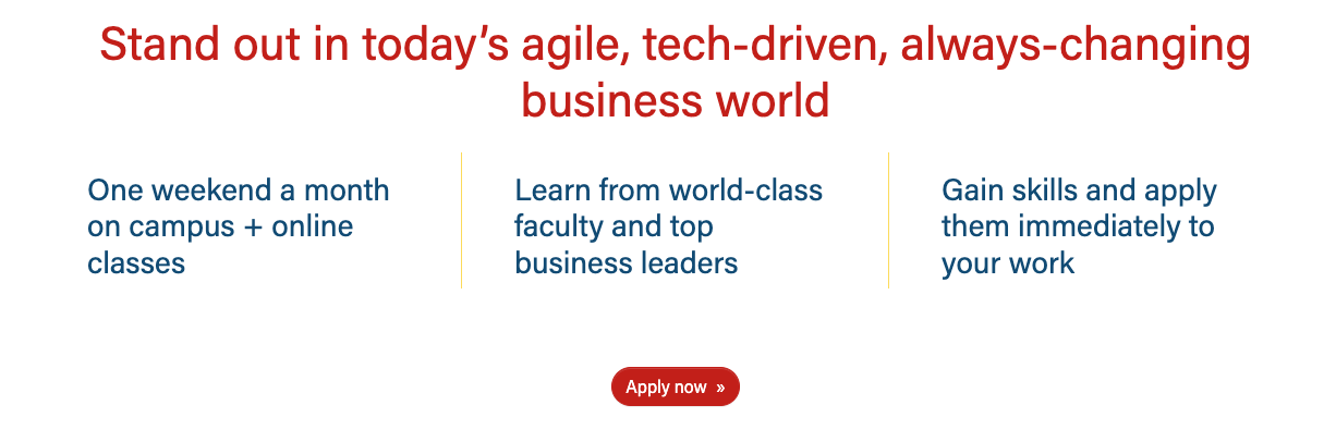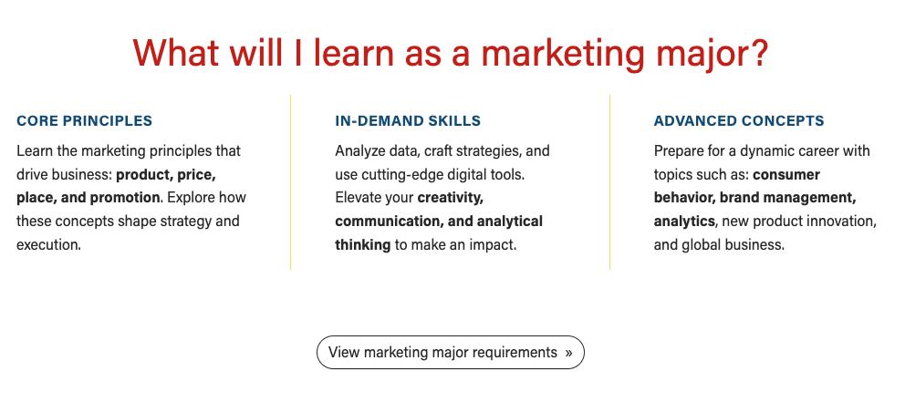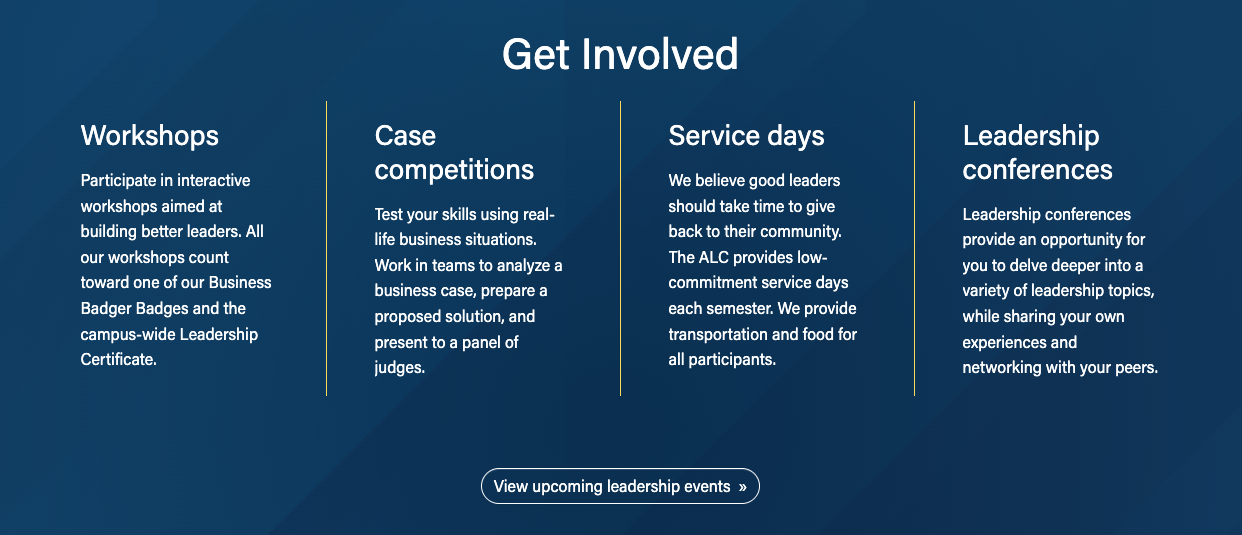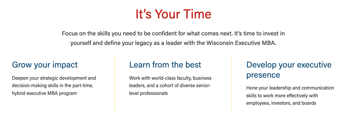 A block that groups short content into sections like cards, with no card outline or shadow. Used often at the top of program pages to introduce three important claims or differentiators.