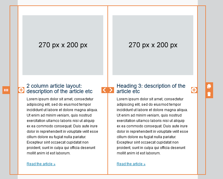 Should only be used if you have an even number of articles (not including the featured article, if you choose to use it). Make sure the images you use for these are the same size if they're in the same row (270px by 200px is suggested, but just an approximation). To add more articles to your email, select the entire row ("layout") and click the copy icon.