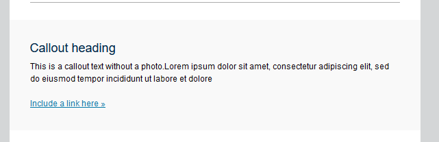 Callouts can be used for announcements, or other important information. They include a gray background color, a paragraph with a Header 3 title and a link, and sometimes a photo.