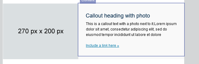 - If you use the callout with photo, keep the text short so it doesn't go past the photo. The photo size of 270x200 is a suggestion, and you can use a different photo size if it fits.