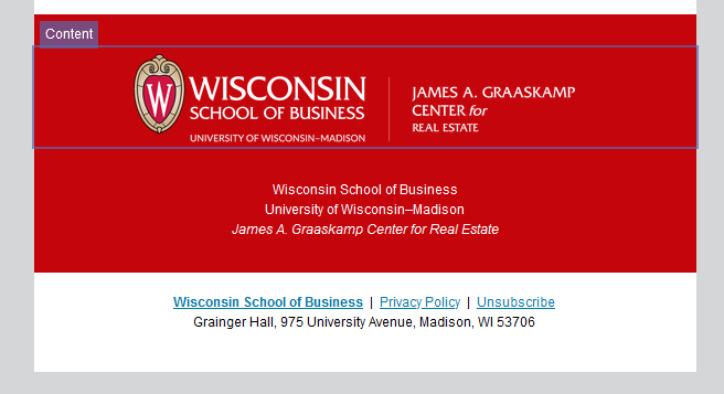 The header includes the "Trouble viewing this email?" message (which will open up the email on the web), followed by the WSB Crest, "Wisconsin School of Business" and the name of your program.