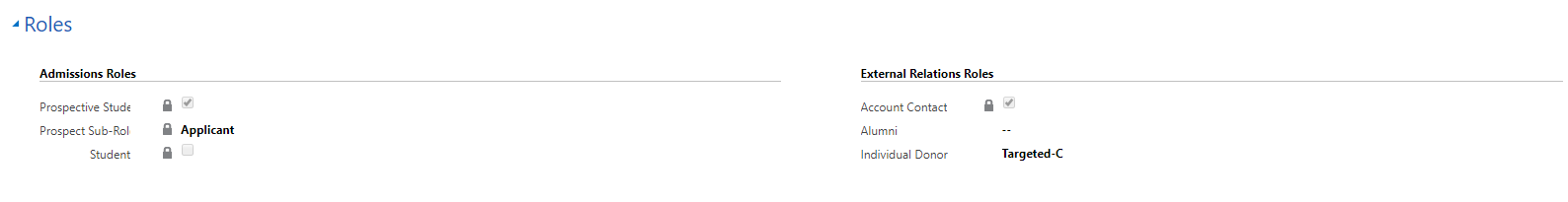 This section of the person external relations view shows the roles the person has. This includes their admissions roles and their external relations roles.