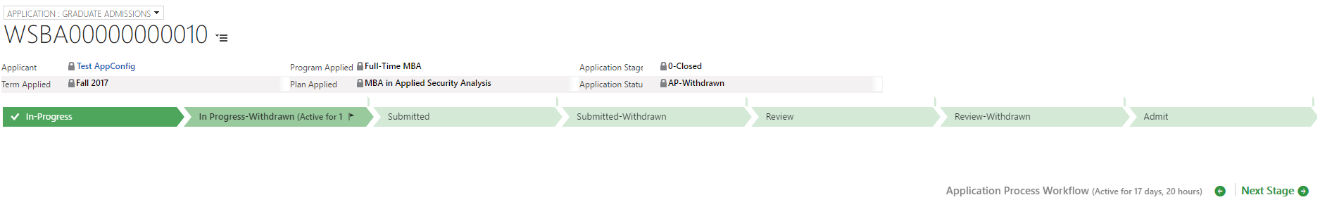 With the upgrade to Dynamics 2016, this can now be handled in the Application Workflow Process ribbon. The application can be withdrawn by toggling the "Application Withdrawn" button to "Yes" and selecting "Next Stage."