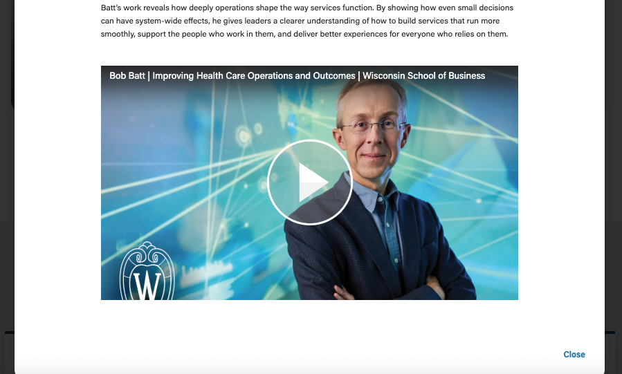 image.alt = "Youtube Thumbnail for Bob Batt | Improving Health Care Operations and Outcomes | Wisconsin School of Business"; //Tells screenreaders that the image is labelled by the title of video