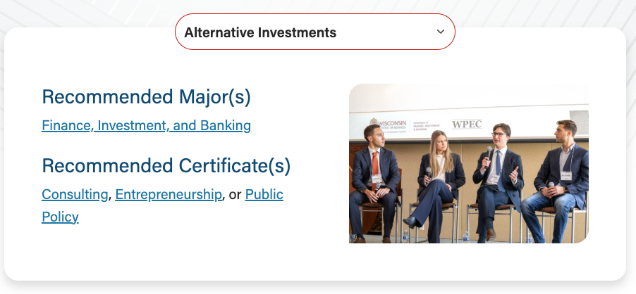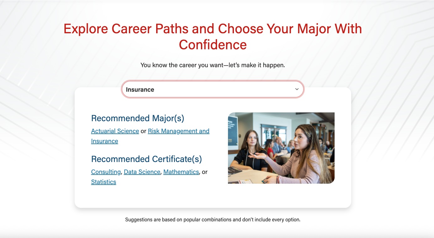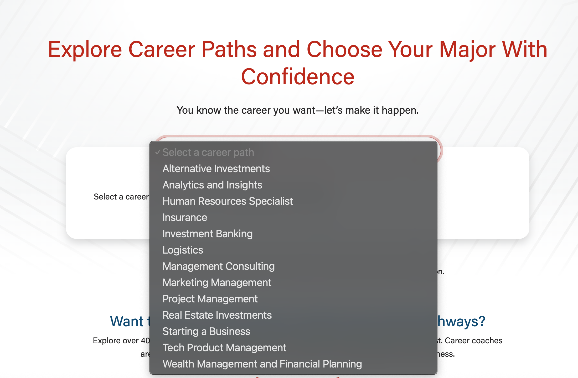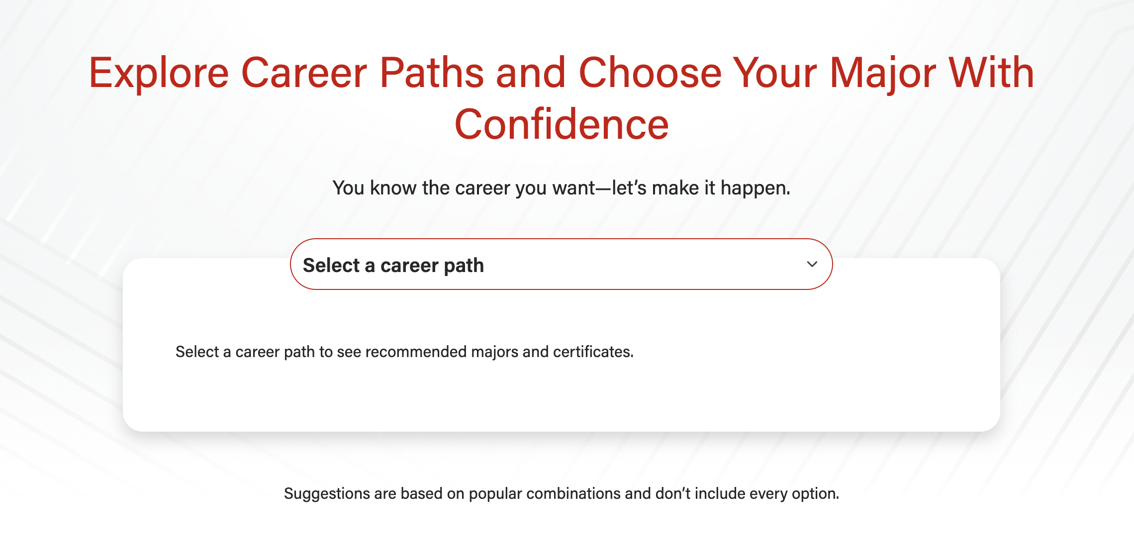 - Supporting content/card placeholder text - "Select an option to see more details", "Select a career path to see recommended majors and certificates."
