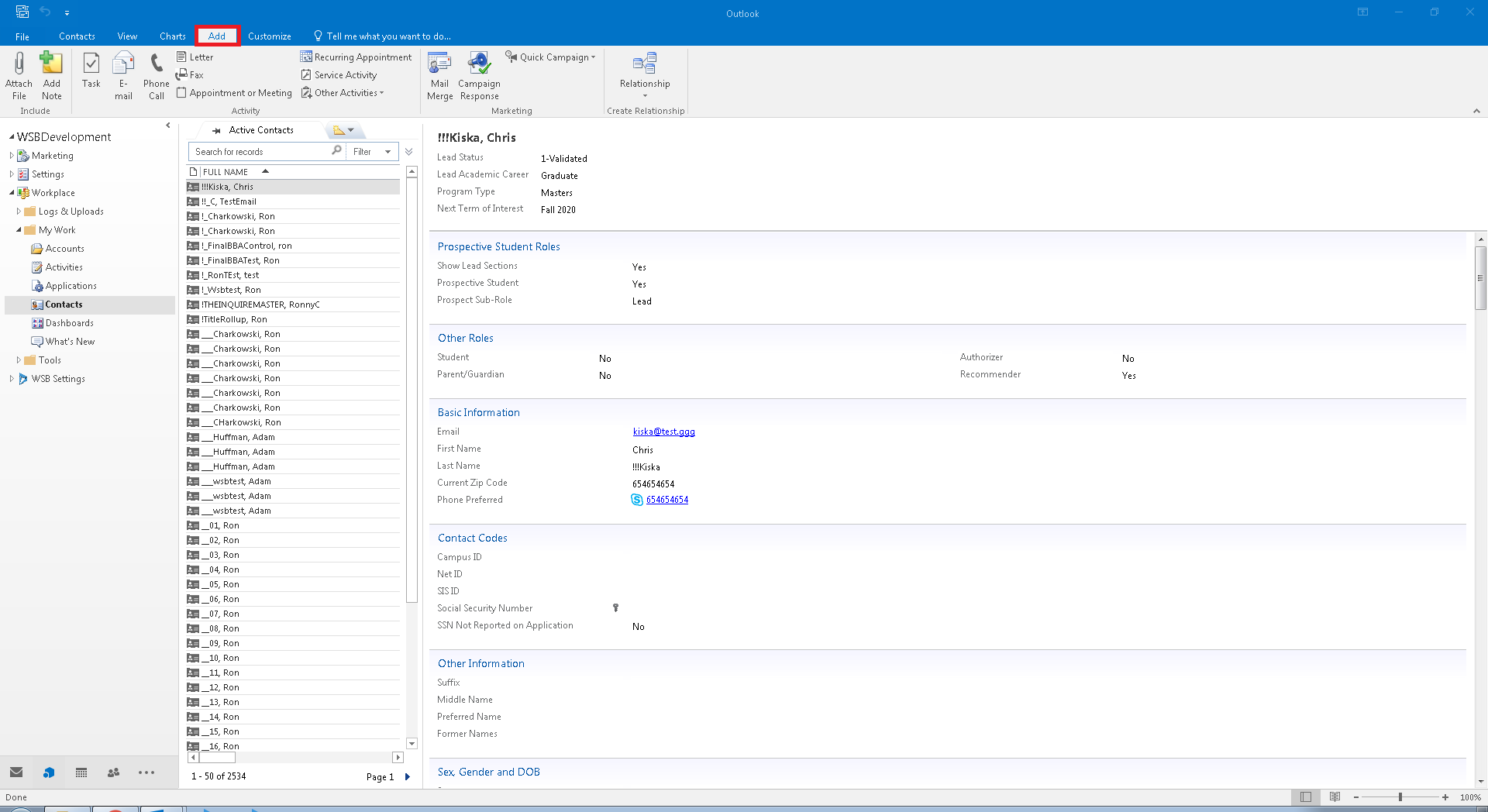 To add a new activity to the contact, select the "Add" tab at the top of the page. Select the activity type you would like to add, and a web wrapper for LRM will open. Fill out the information as usual, and save.