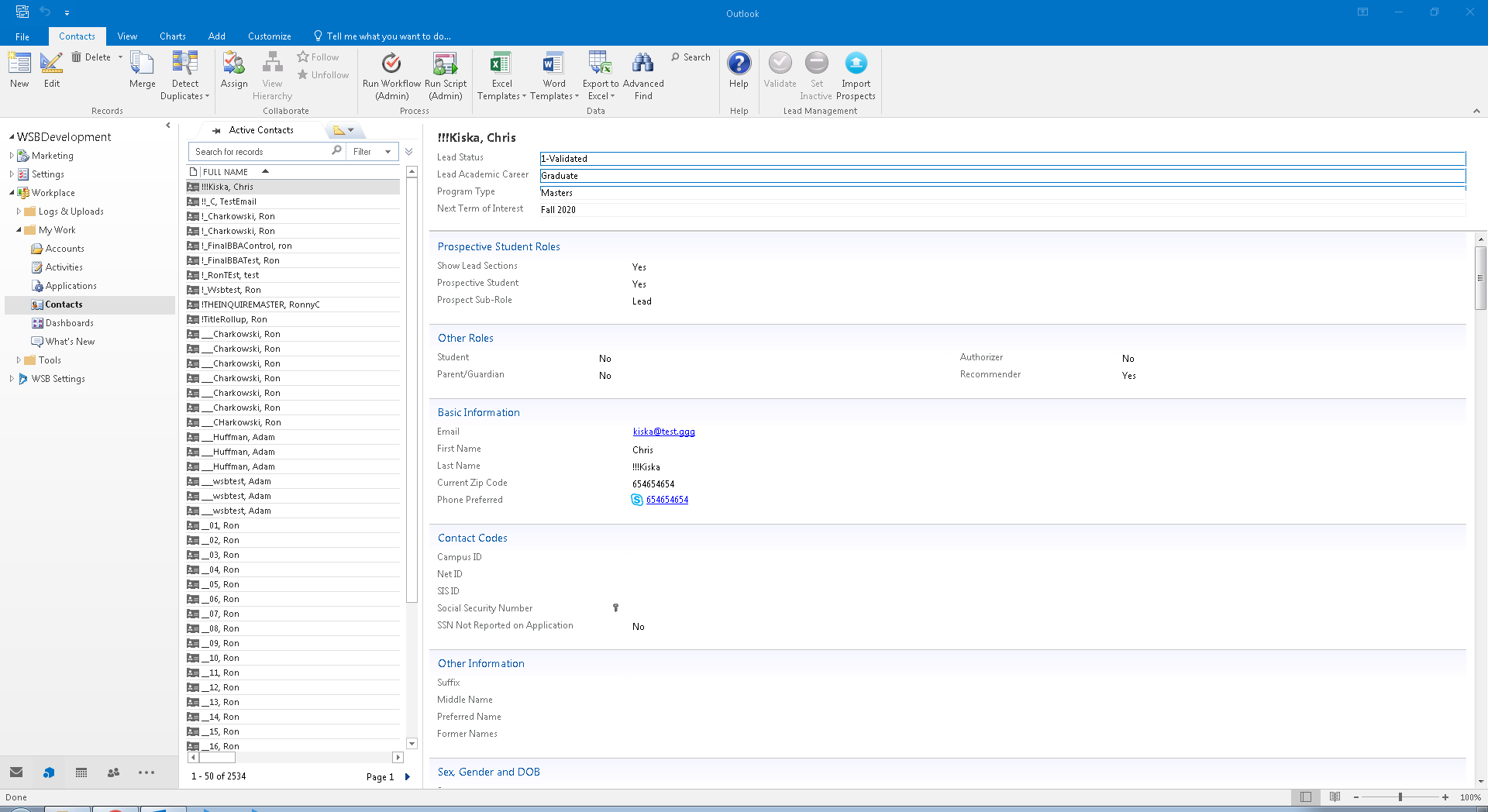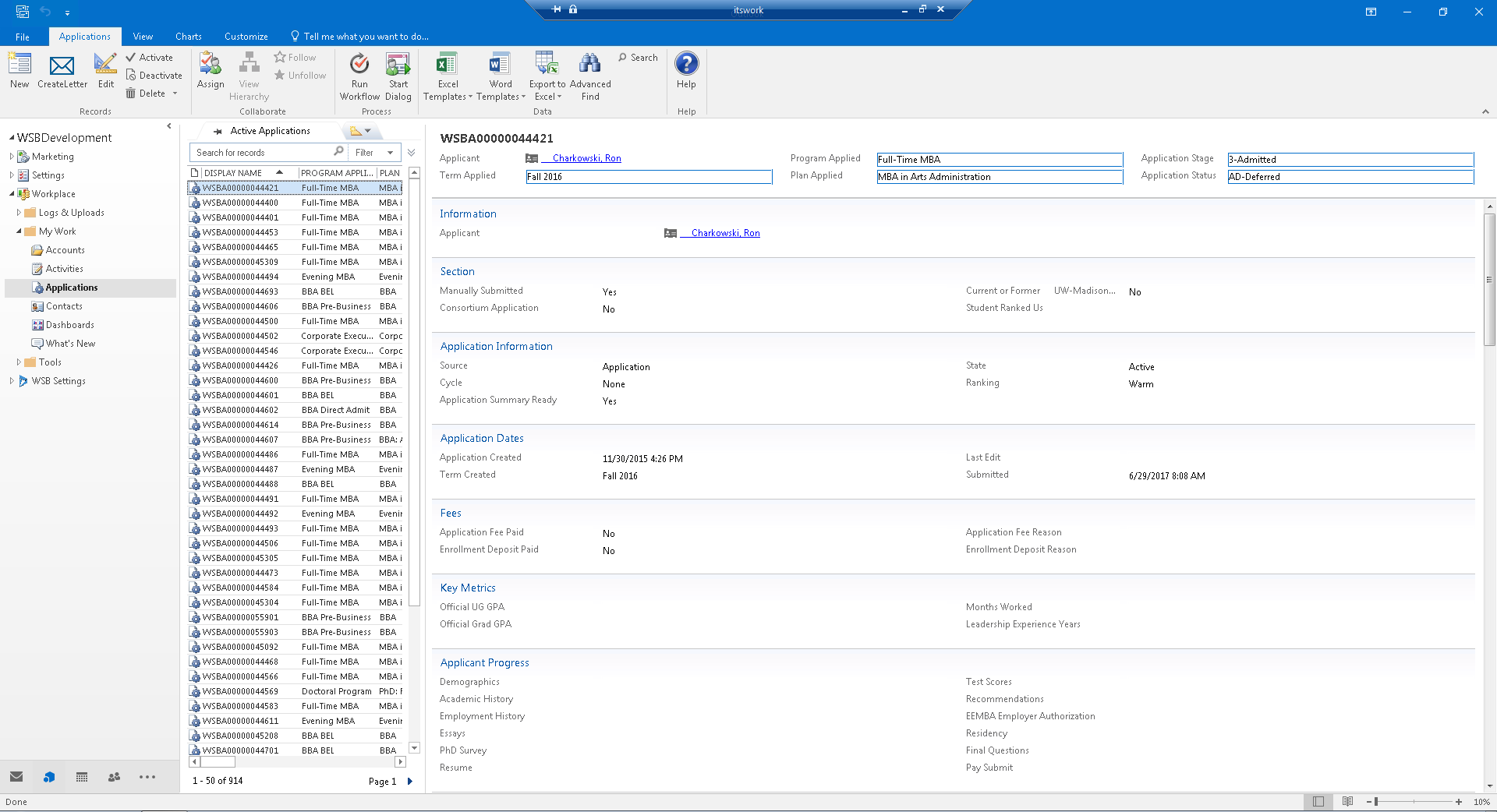 The application view is similar to the contact view. From it, you can query for certain applications, run an advanced find, create decisions letters, edit, and activate/deactivate an application. All of these functions can be found in the ribbon at the top of Outlook. For more information on application managment, view the articles located here.