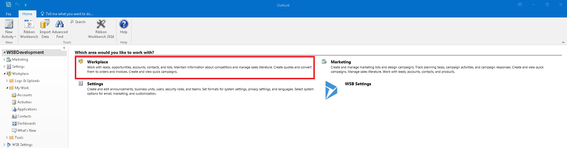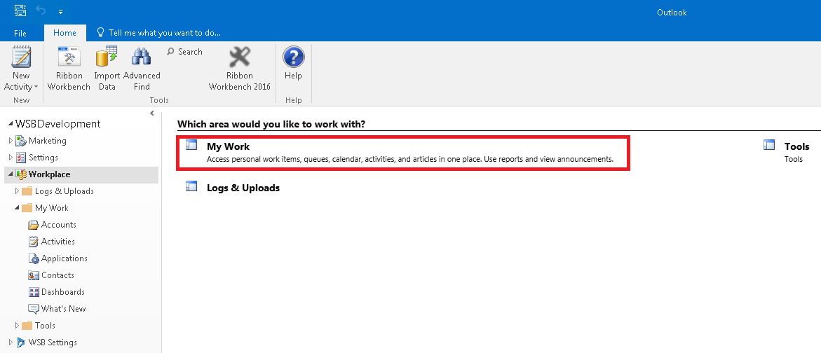 You can also navigate to different sections by going from the main screen to Workplace > My Work and then which ever area you would like to work in (Dashboards, Contacts, Applications, etc.).