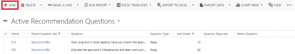- To add a new question, navigate to Recommendation Questions and select "New" near the top left of the screen.