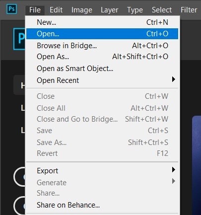 Once you have Photoshop open, you can open your image by navigating to File > Open