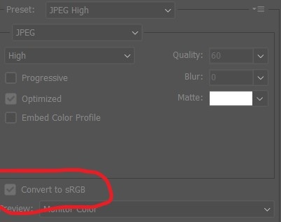 On the pop-up window, make sure Convert to sRGB is checked (Photoshop does this automatically), and then save.