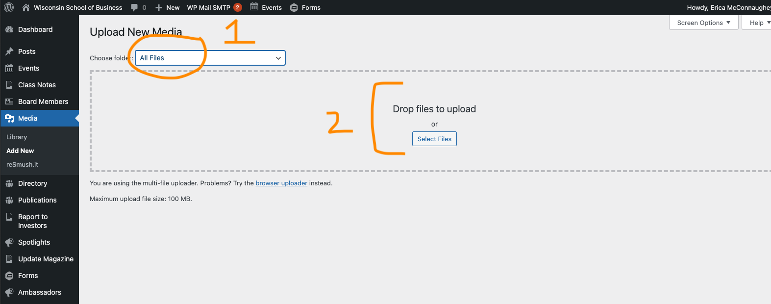 - (1) Select the media folder your image(s) should live in. (2) Drag your image(s) to the page or click the Select Files button and search for your image(s) on your computer.