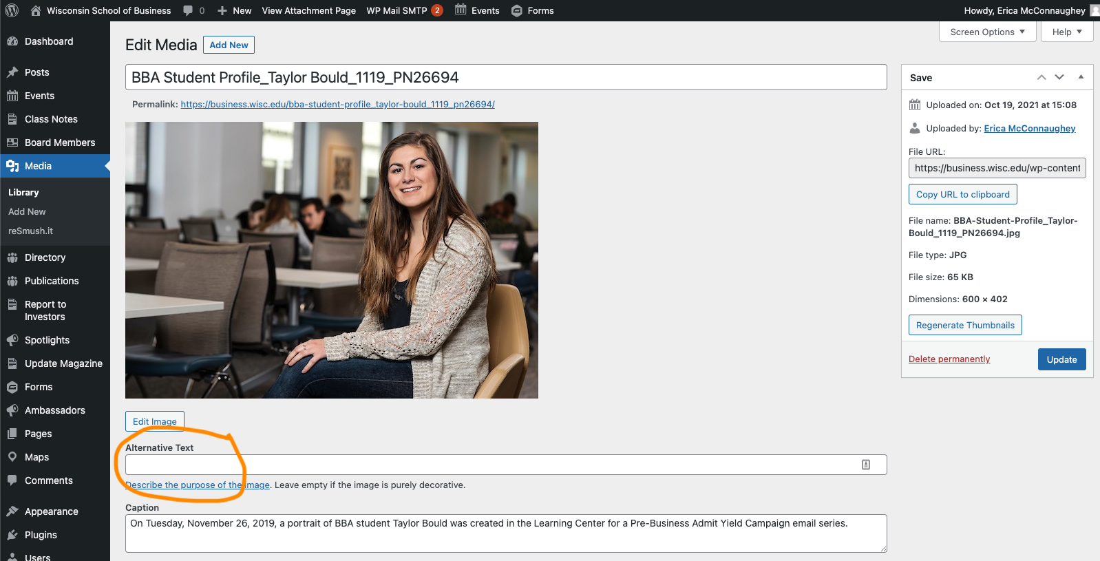 Tip: Anytime you upload or go to use an image from the media library, check to see if the image has alternative text. If it doesn't have alt text you must add it, request that the person who uploaded the image add it, or request that the web team add it for you if you are not allowed to.