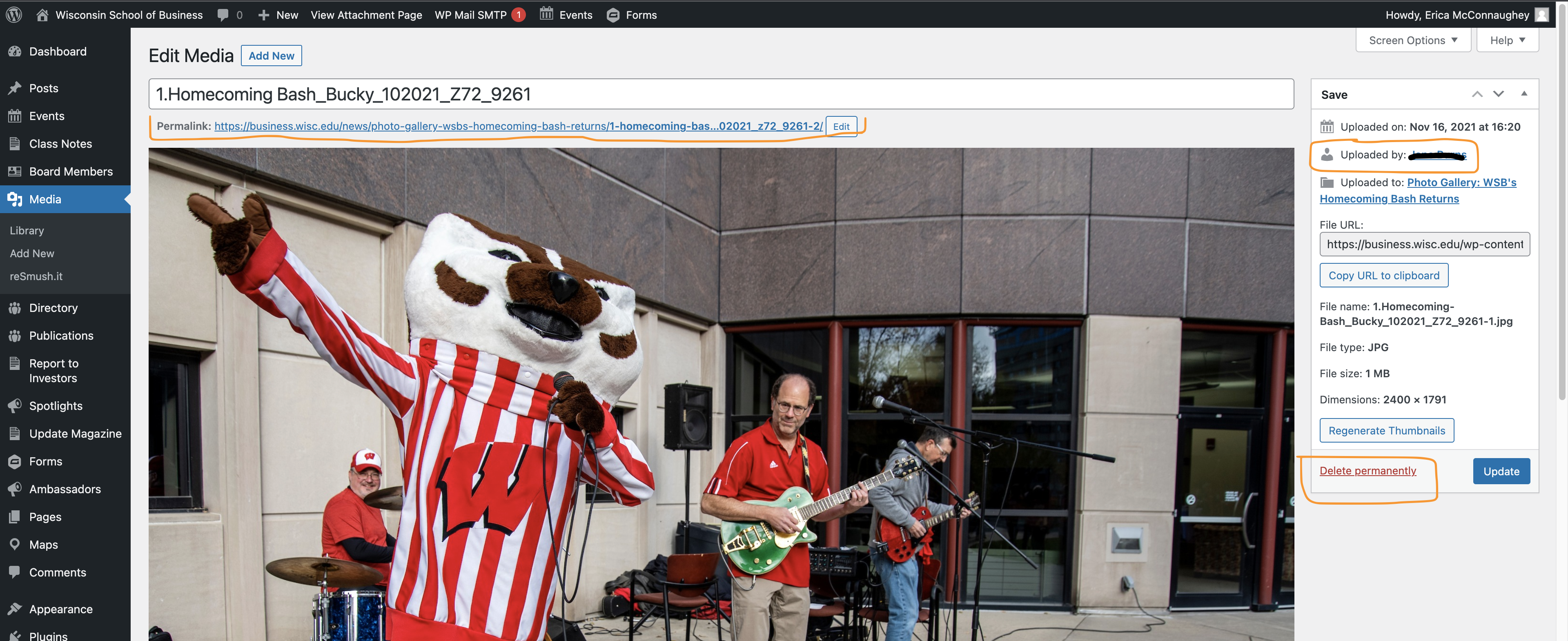 If you no longer need to use an image on the website (or if a duplicate image was uploaded), you should delete it from the media library. It is best to delete the image immediately, so that it doesn't get used by someone else editing our website, events, or blogs. Be careful here, if an image is in use and it gets deleted from the media library, the page will display a broken image.